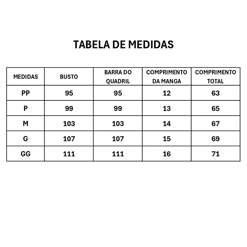 PP: Busto 95 cm, Barra do Quadril 95 cm, Comprimento Total 63 cm, Comprimento da Manga 22 cm, Medida do Ombro 12 cm